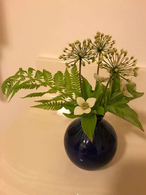 One of my little rituals while at the cabin is to fill three small vases with the blooms and greens I gather from my first walk. I grab my scissors and walk the yard, driveway and road ditches. I guess you could say I forage for flora. Flora is the plant life of a particular region, that naturally occurs without our help. Indigenous species—aka native plants. We are in a little pocket that touches Lake Superior’s south shore in northern Wisconsin. In fact our little town of Cornucopia’s claim to fame is its location at the northernmost point of Wisconsin. Bayfield, just 20 miles away has a whole drive dedicated to orchards and berry farms. Strawberries, blueberries, raspberries are here for the picking. And of course the Apple Fest in early October is an invitation for visitors to celebrate the varieties of apples that grow here.