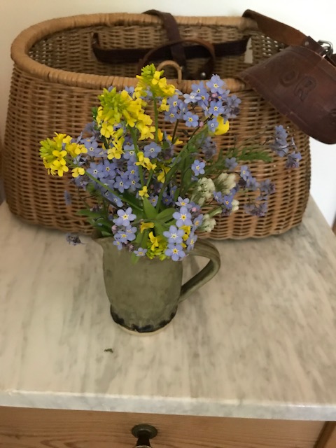 This time I find pale blue forget-me-nots at the edge of the woods, pussy toes in the yard, white narcissus along Thunder Bay Road and marsh marigolds next to the bridge over our drainage ditch. There are new discoveries– like the nodding trillium which I wouldn’t cut, but admire its delicate and hidden beauty. I like to study these gifts of nature that continually surprise me in their variety and numbers. At one point last summer I could identify more than 20 species blooming around us. The field guide Wildflowers of Wisconsin by Stan Tekiela is my reference.
