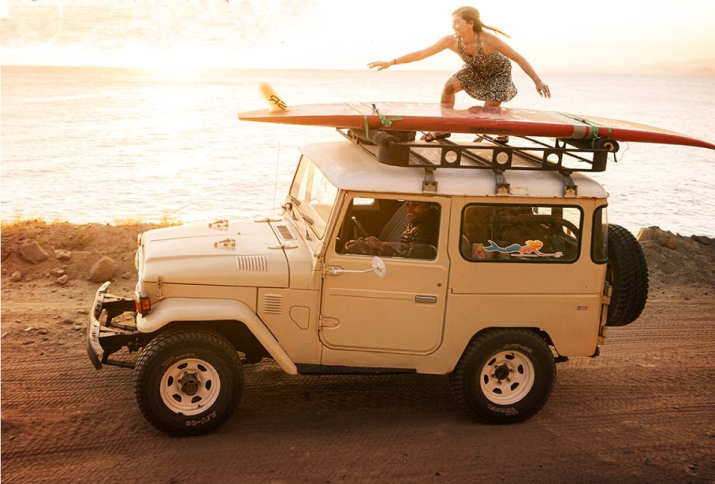Title Nine sends their catalogue to me. Even though their products no longer fit my body nor my demographic, I flip through the pages of young women climbing rocky cliffs, paddling, and biking in colorful, stretchy waterproof clothing– uniquely designed for each sport. The latest issue caught my eye. A woman (in a dress) balances on the roof of an old International Scout, the same model my husband drove when we first met. I study her solid stance, legs bent, arms outstretched, balanced at her very core. She looks brave and strong.